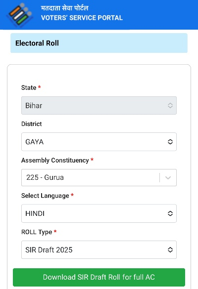 Then, select your State, District, Assembly Constituency, Language, and in the Roll Type section, choose the option for Draft 2025.