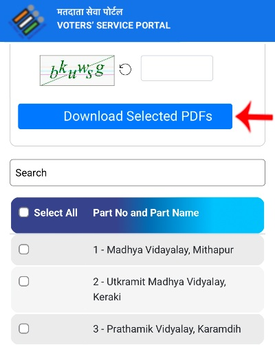 Step 2 : Next, enter the given captcha code and select the Part No. and Part Name corresponding to the location where you go to vote. After that, click on the Download Selected PDF option.